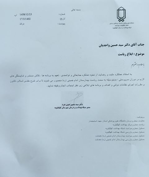 به استناد عملکرد مثبت و رضایت از نحوه عملکرد جنابعالی و توانمندی،تعهد به برنامه ها،تلاش مستمر و شایستگی های لازم در دوران سرپرستی ،بدینوسیله به سمت ریاست بیمارستان امام خمینی(ره) منصوب می شوید تا برابر شرع مقدس اسلام،قانون و مقررات اجرای نظامات دولتی و اهداف و برنامه های ابلاغی زیر نظر اینجانب انجام وظیفه نمایید.